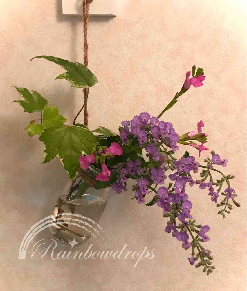 雨で庭遊びができないので、ネペタとチェリーセージを摘んで飾ってみました。