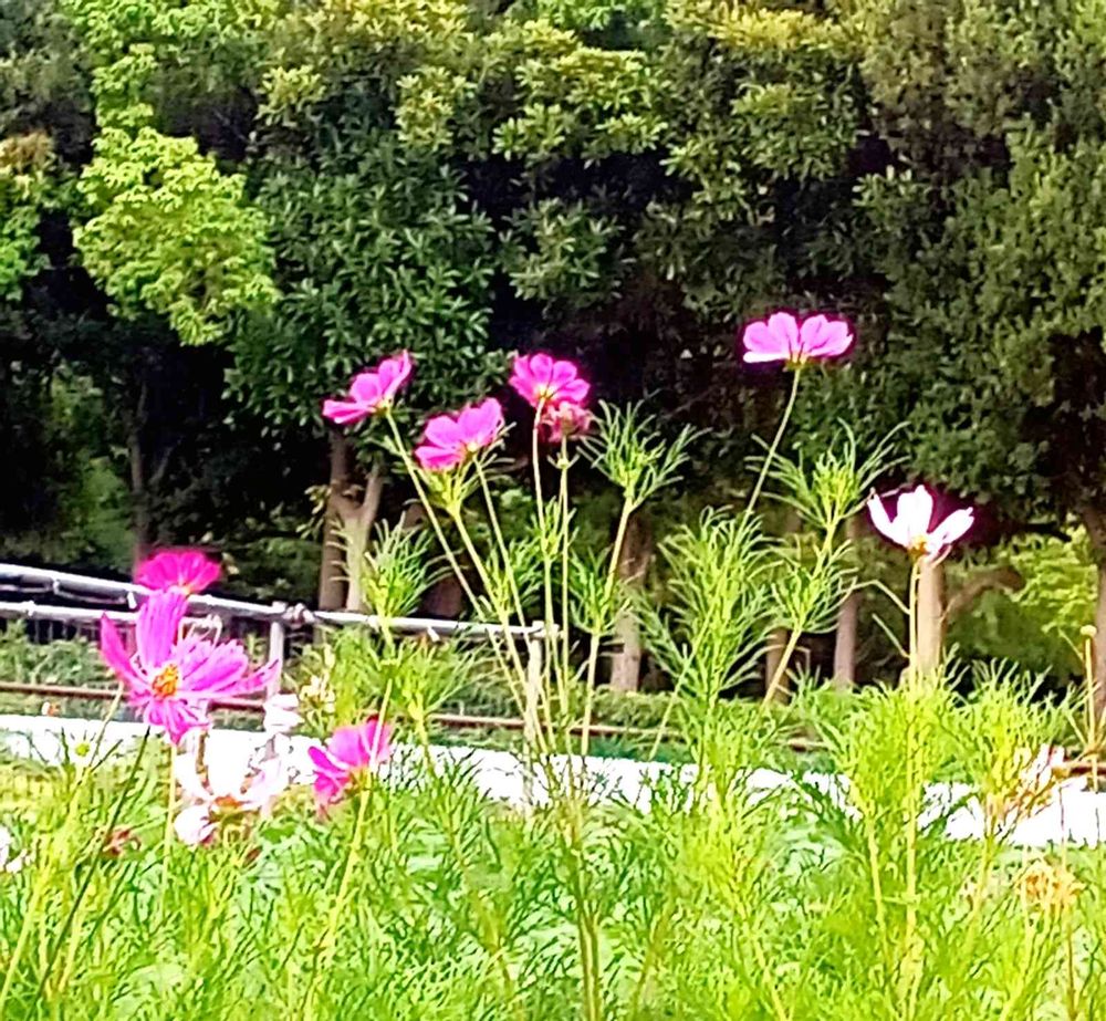 通り道の畑で、コスモスが風🍃に揺れていました。