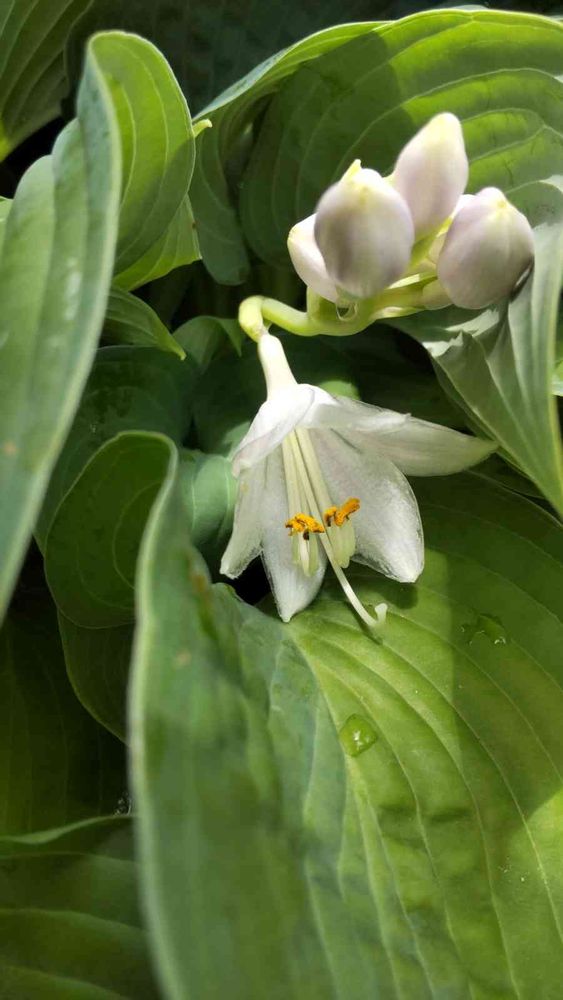 ギボウシの葉の間から花が咲いているのに気づきました😄