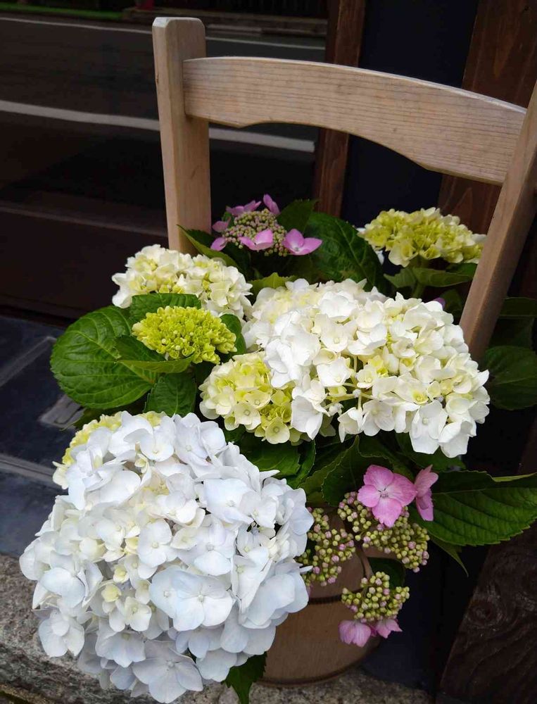 紫陽花は、水揚げしないとクテッてなってしまうんですが、京都の方は、シッカリ水揚げして、さりげなく飾ってますね🥰