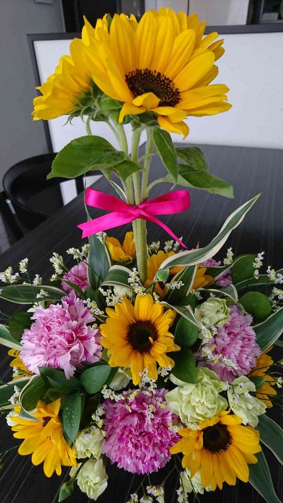 主役のヒマワリが引き立つように、トピアリー風にアレンジしてみました。