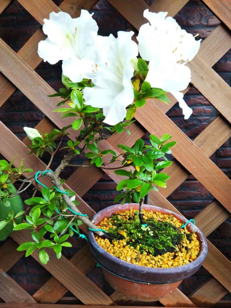 体🤸型😄樹系をいじってます🙇さつきの白、👀近づき見ると微妙に赤の横縞入ってます。園芸に導いた師匠からの頂き物、師匠のさつきの中に縦縞出来れば🤔黄🐅色に黒縞つくって🙇お願いしようかな。👣👣👣👣👣園芸店・さつき展覧会回り探してます😄これは咲いてきたから、日陰の駐車場に置いてます😋