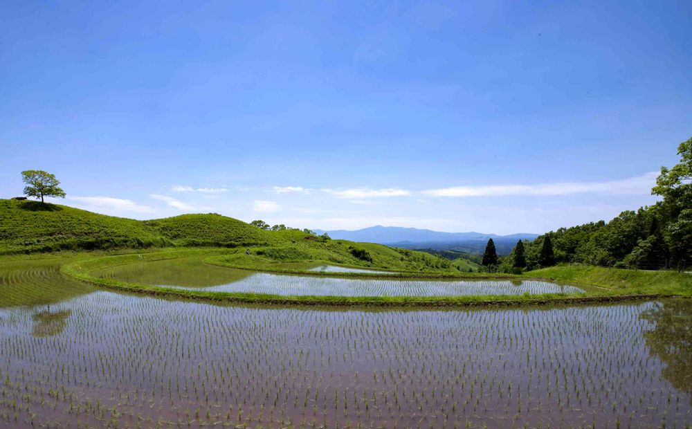 水田と空、遠くに山も、いい景色ですね。木の左に一頭発見🐂