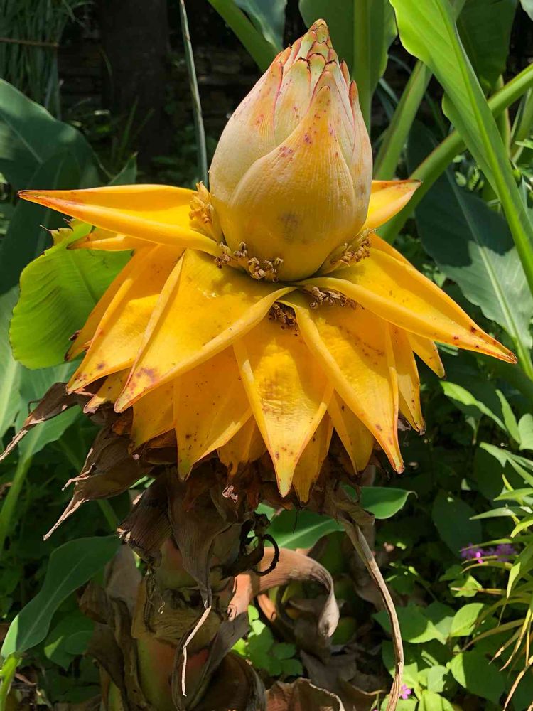 「花の大きさは約30cm。バナナの仲間で黄色の花のように見えるのは苞と呼ばれる花弁状の葉。花はその間に小さく咲いている」と、札に書いてありました💛