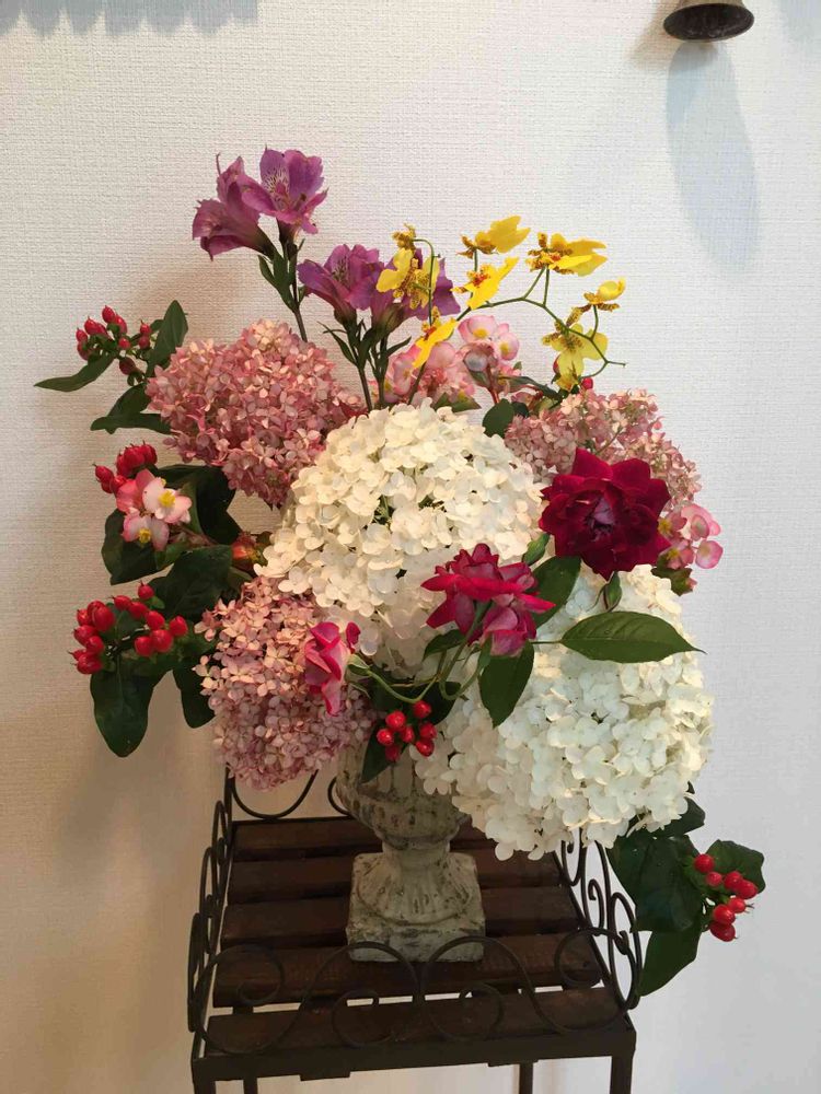 アナベルが雨に濡れ頭をもたげていたので、カットして他の子達とアレンジしました🌸🌹
