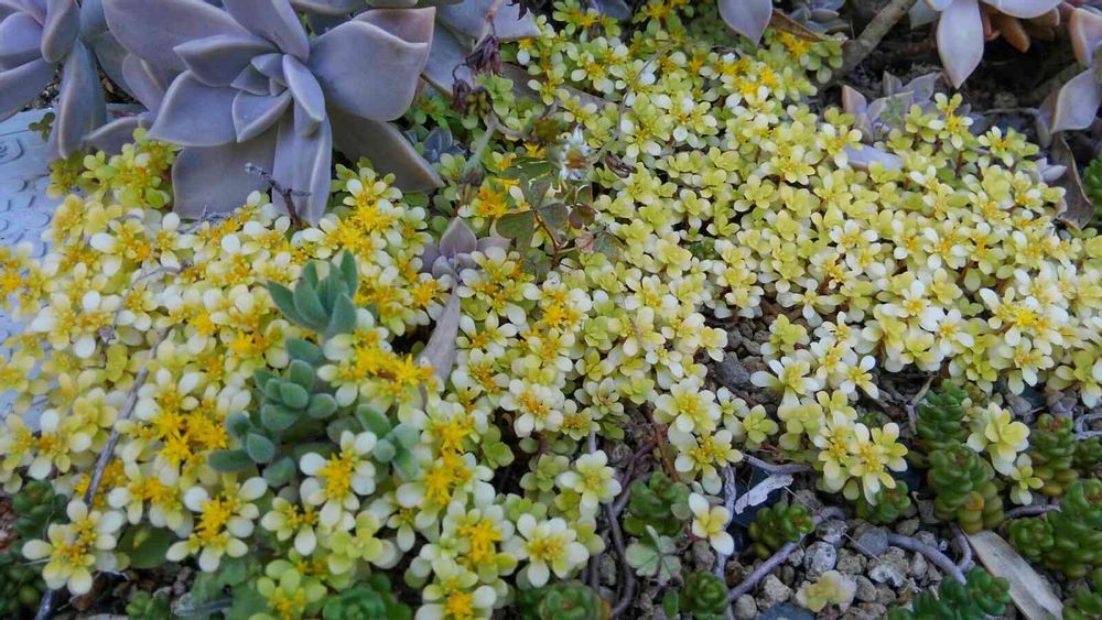 マンネングサの小さな花ほんとに可愛いですね😘どれも同じように黄色い星✫みたいな花つけてますが、どうやって見分けるのか?