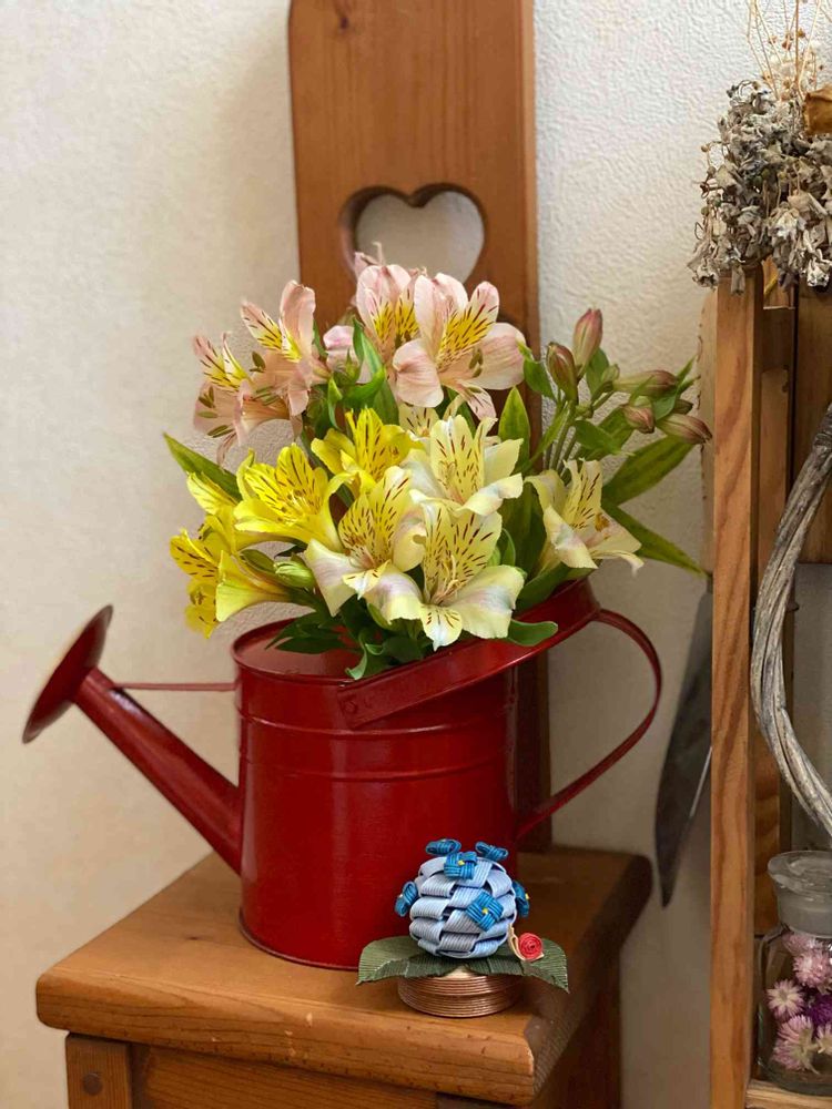 真っ赤なジョウロ💧💦お花に