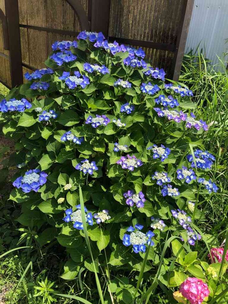 今年はいきなり蒸し暑い日が続いて、アジサイの色も早くから濃いブルーになっている。