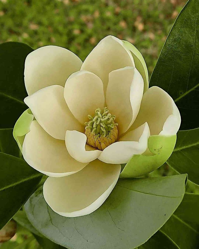 モクレン科モクレン属の半落葉高木。北アメリカ原産で昭和初期に渡来し、庭や公園に植えられる。葉は光沢がある長楕円形。葉裏が白い毛で覆われるためウラジロタイサンボクの別名もある。原産地では常緑だが、日本では一部紅葉し落葉する。花期は6月。直径10㎝前後の白花を上向きに咲かせる。花被片は6~15枚。果実は袋果。熟すと裂けて赤い種子を出す。