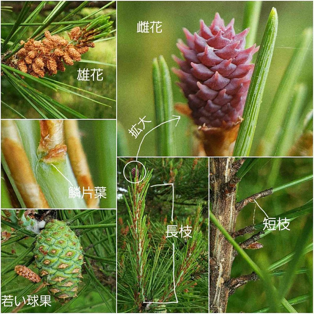 マツ属には長枝と短枝とがあります。長枝は最初の頃は鱗片葉のみがつき、その葉腋から短枝が伸びて葉が芽吹きます。アカマツでは雌花は長枝の先端につき、雄花は長枝の基部につきます。左下の若い球果は、来年の秋に熟します。