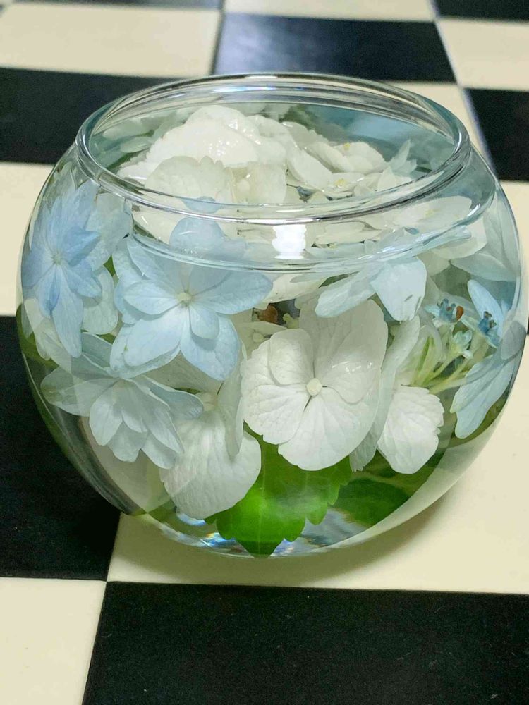 ガラスの器に入れたら、素敵な紫陽花ボールになった(^_^)
