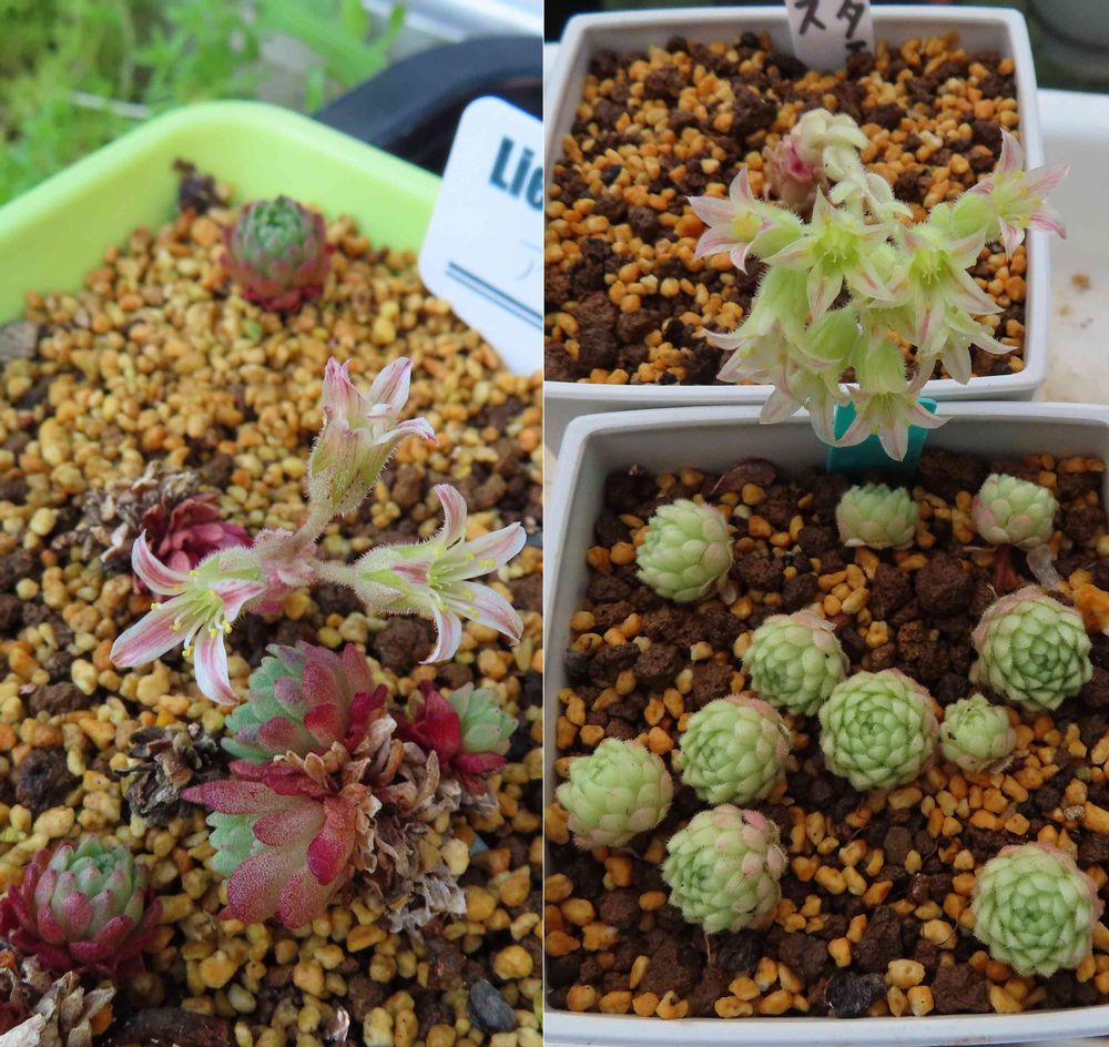 1週間前にpostしたクリサンタエルブルースの花が満開になった。前回は画像に収めなかった子株たちも右下に,同じく花が咲いたアトミーも左側に載せてみた。