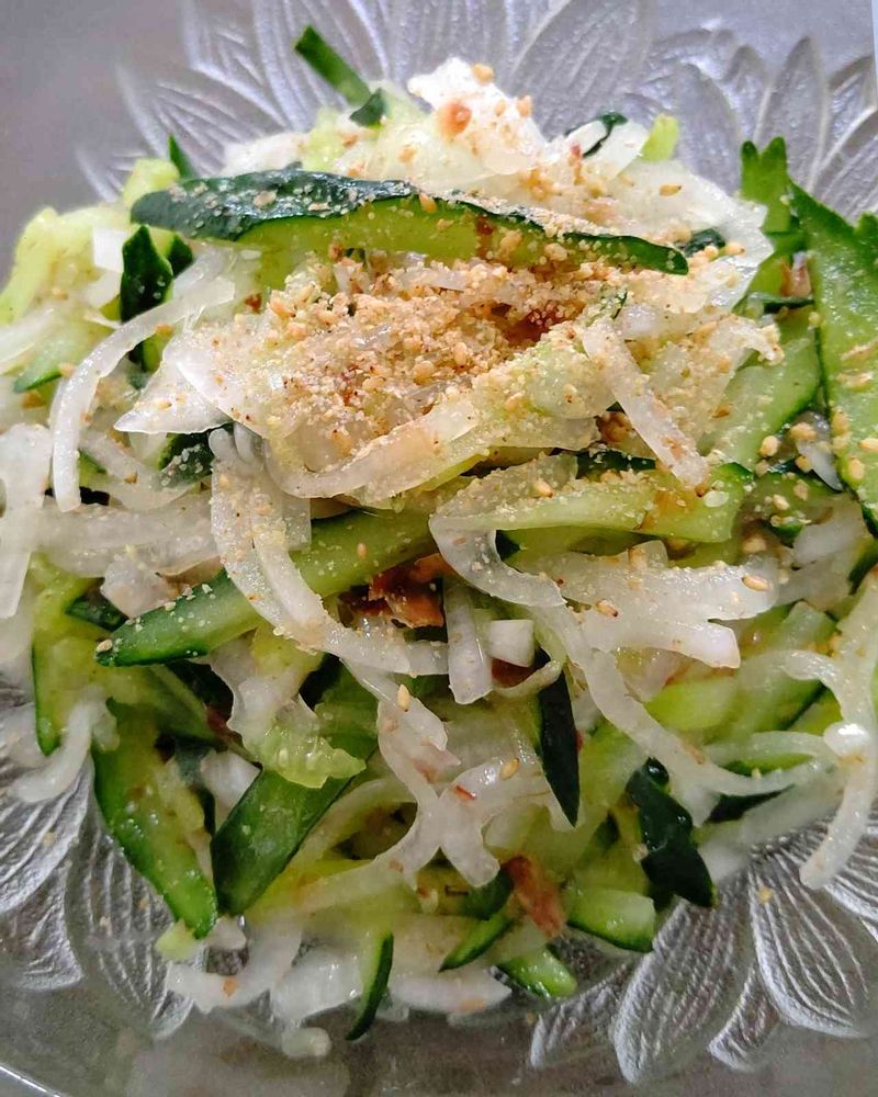 ②塩をふり手でよく揉んで、しんなりするまで置いて、水気をしぼる