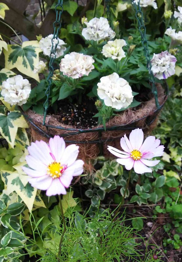 ペチュニアさん、今年は長雨なので、鉢植えの子は陽当たりのいい軒下にずっと置いていて、(入れたり出したり面倒なので)この八重咲きさんはハンギングしているので、雨の日だけ軒下に😉