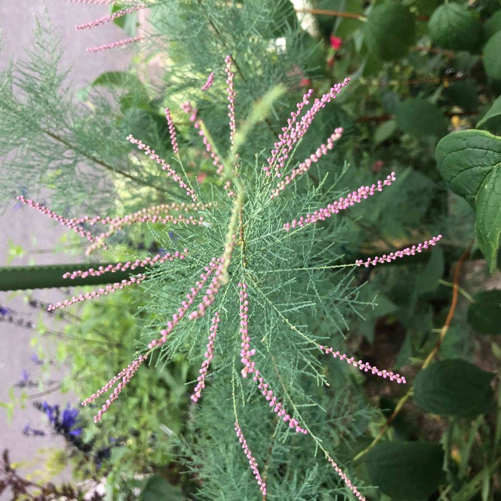 針葉樹の上の方にピンクの花?がついてます