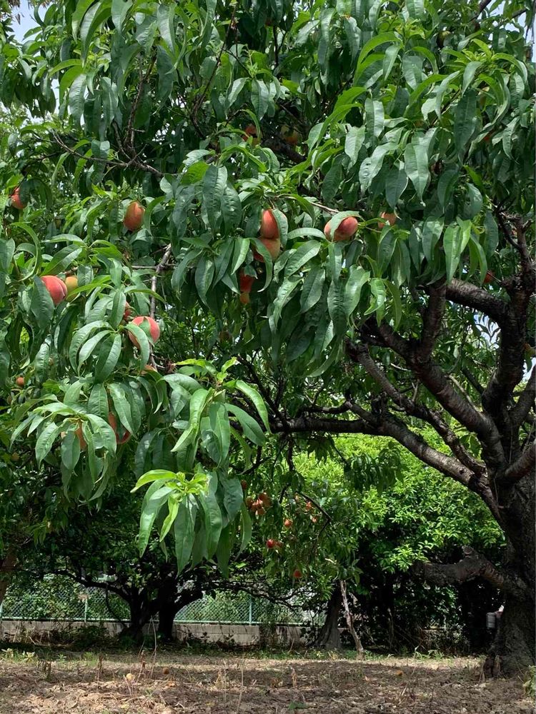緑濃い葉っぱの陰に桃の実🍑が色付いています。
