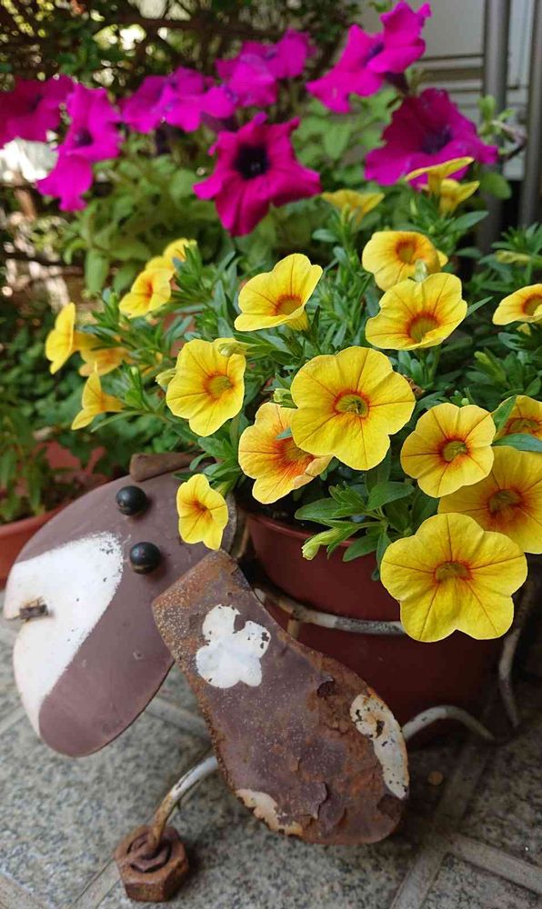 我が家の玄関でお出迎え。年季が入ったワンちゃんの鉢カバーに、黄色の可愛いカリブアコア。