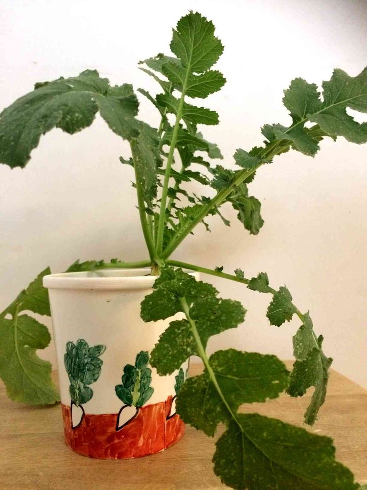 4月のマルシェでいただいたすくすく栽培キット。2ヶ月でミニ大根がこんなに立派な葉っぱをつけました!