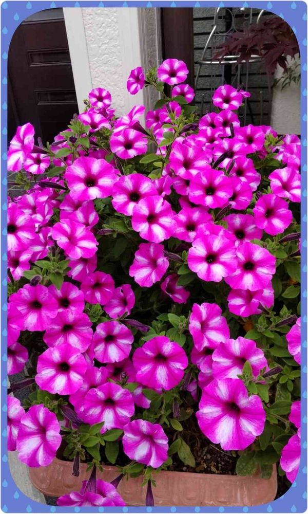 昨年、主人が選んで育てていたあふれ咲きペチュニアさん。本当に元気な子で、挿し木で増えて、冬の間も玄関の軒下で🌿を繁らせ、5月にはフッサフサでした❗
