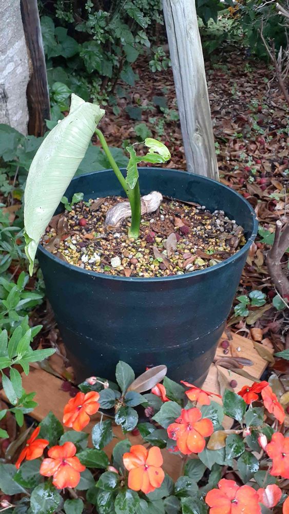 枯れ死したと思ってたので花壇に放置していたモンステラから🌱が出てきました😭