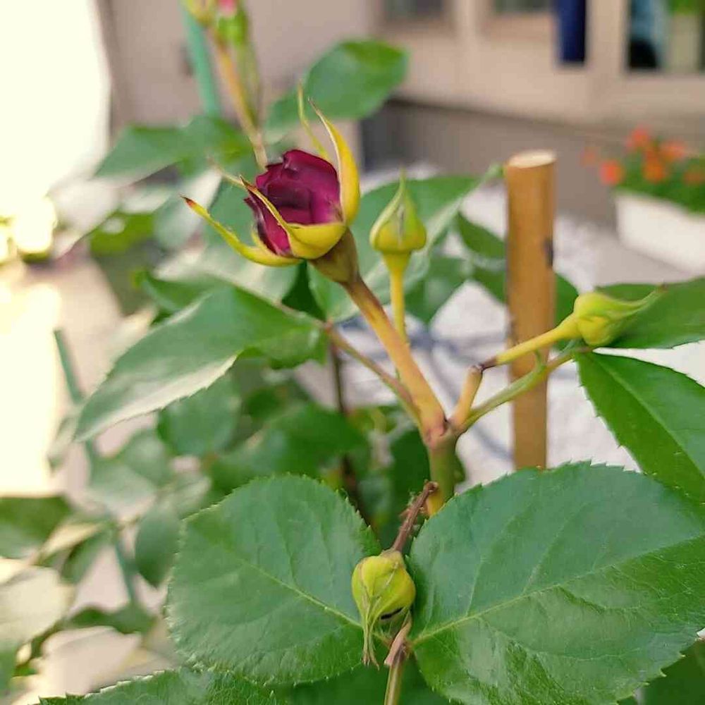 購入してすぐ環境が変わると自分でツボミ落とす苗があるようです。どうしようもないので次待ちましょう。バラを育てているとつぼみの数を減らしたりけっこうしなきゃならないので、慣れましょう。頑張りましょう。