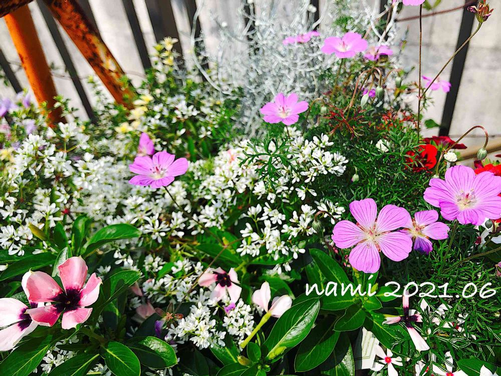 こないだアップしたモネとユーフォルビアの寄せ植えに入れていたカーペットゲラニウムが咲いてきたよ🌸