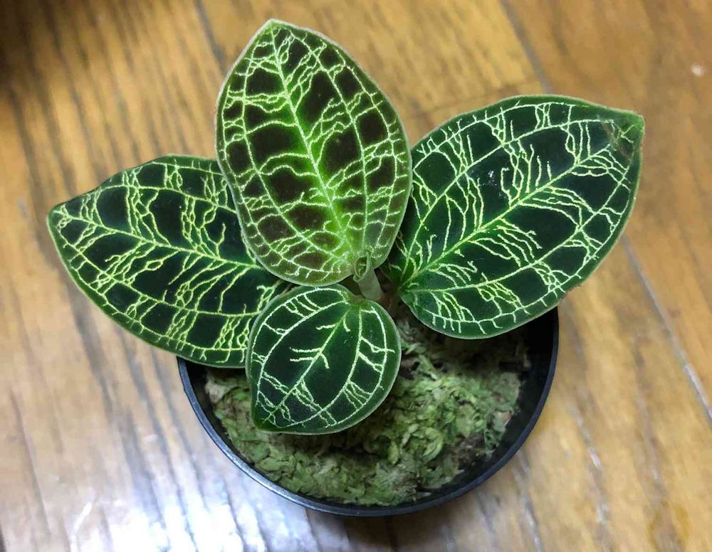 ジュエルオーキッドの一種で画像ではわかりづらいですが葉脈が金色にキラキラ✨しているんですよ😊