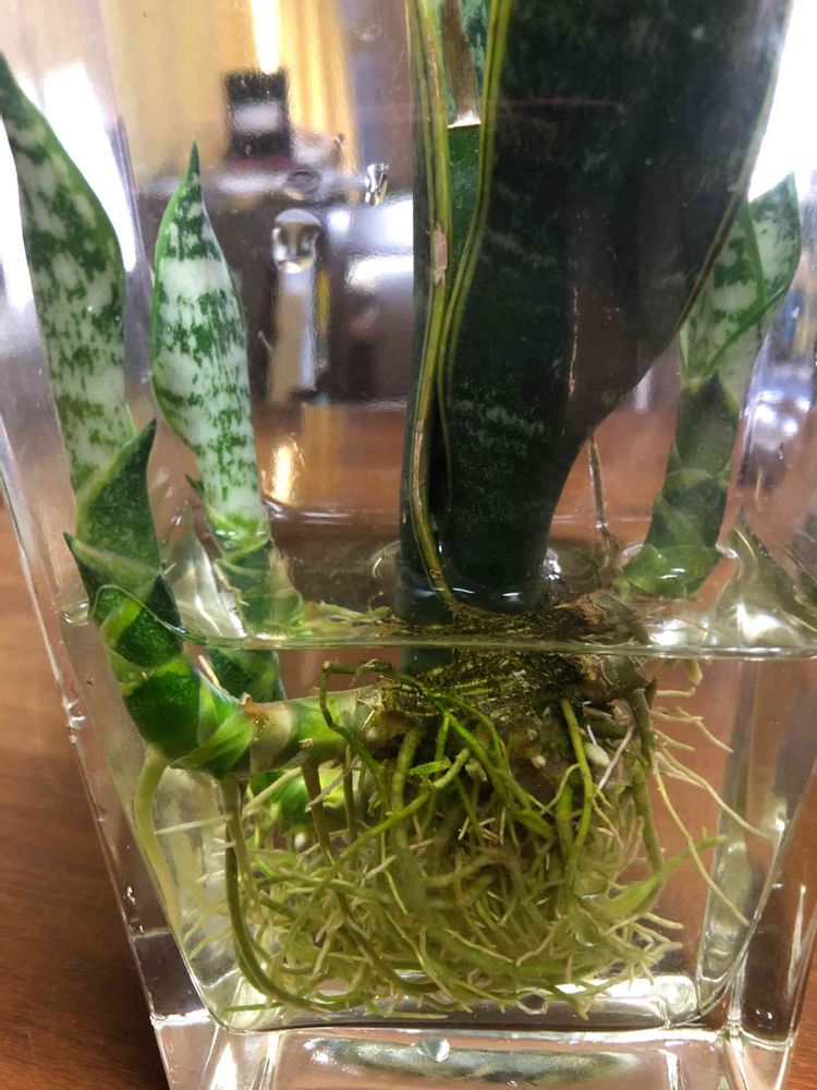 すごい根つこの出かたですね。でも、不思議?サンセベリアは、水を控えめにしないとダメになるのに、水栽培で育つなんて?