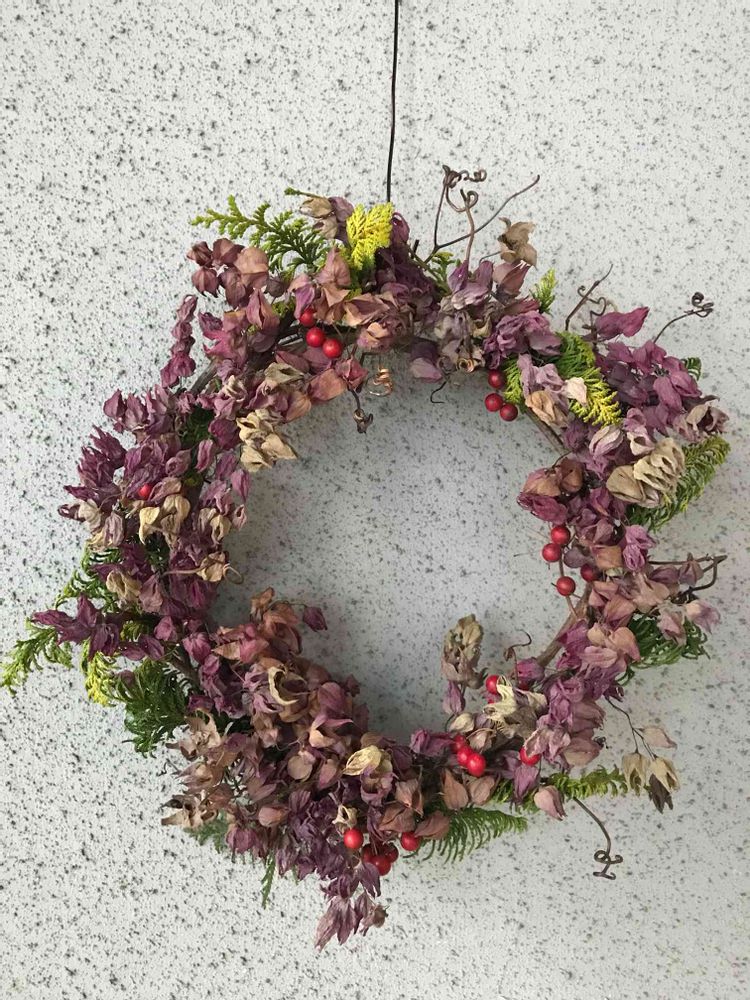 野ブドウのつるにヒバと友達に頂いて来た源平カズラと赤い実をちょっと入れて完成🌸
