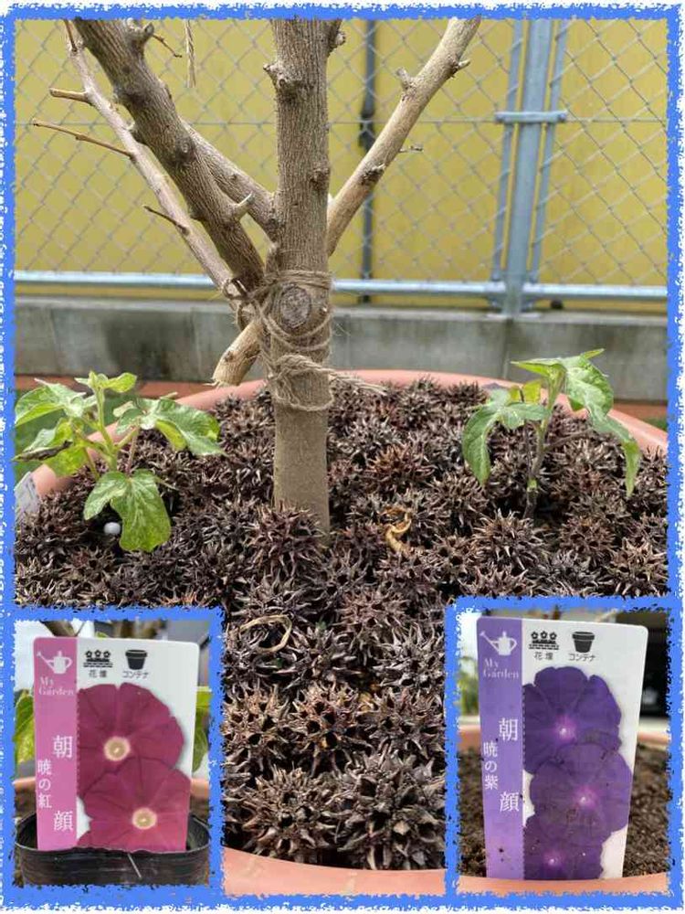 枯れた枝を捨てる気になれなくて、朝顔の支柱にしてみました😓