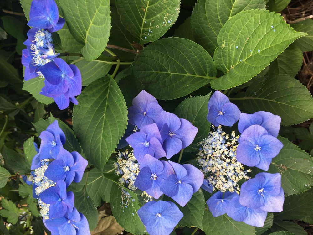 20210615散策で見かけたアジサイの花が,青くて素敵でした。酸性の土壌だとアルミニウムが取り込まれ,花が青いと言う。