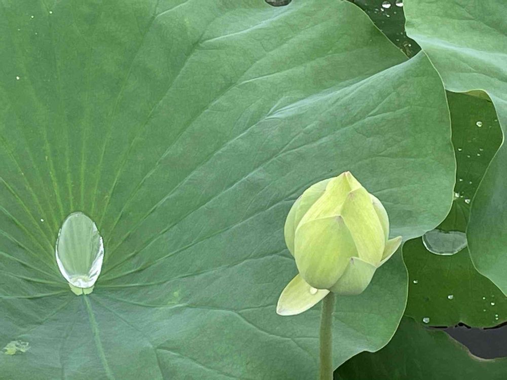 先日のお散歩ではハスの葉の中から蕾が伸びていました!