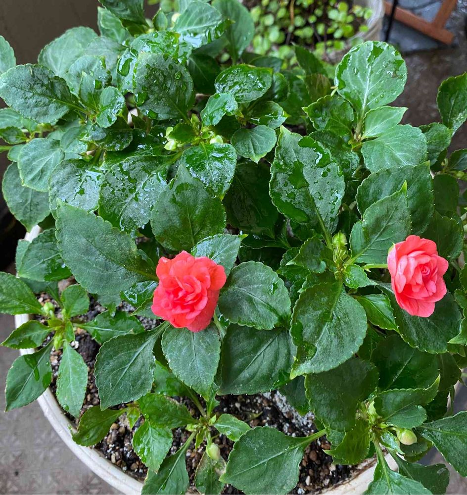 インパチェンスのCOCO、伸び過ぎ苗をカットし、周りに挿しただけの手抜き挿し芽24日目が無事に根付き、蕾を付けています。