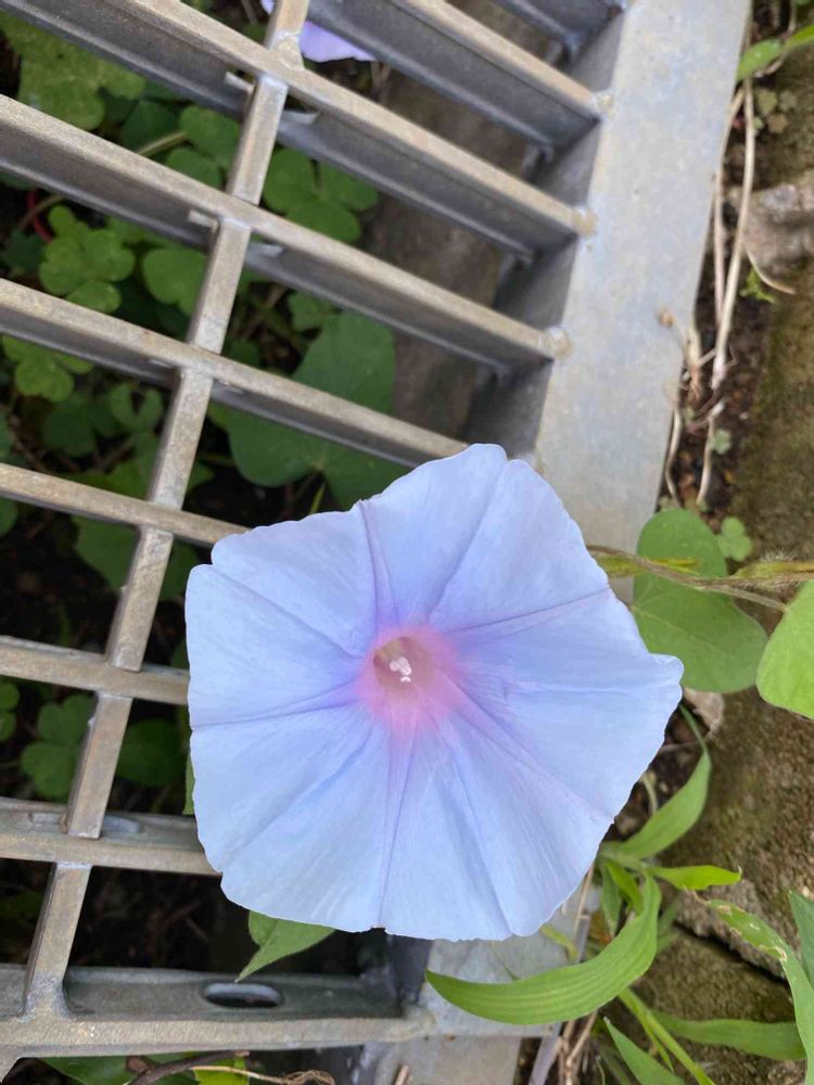 人からもらったタネです。毎年アサガオは夏の終わりくらいになってやっと咲きます。今年は早めにプランターに蒔いたのですが、零れ種が排水溝から咲きました。