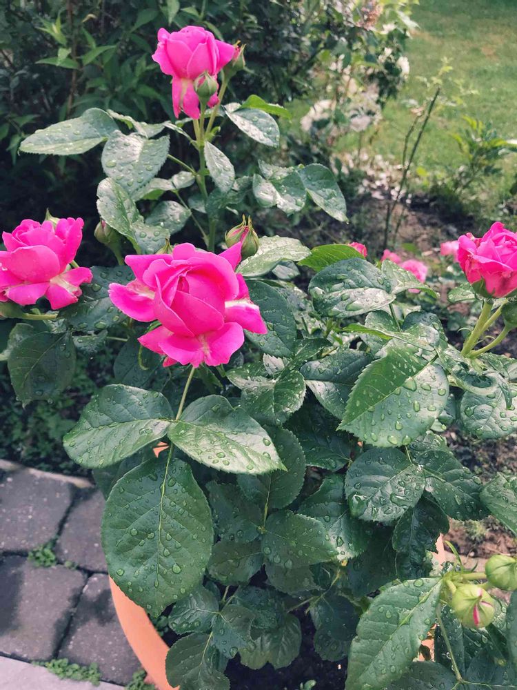 今年買ってテラスに鉢植えで置いてるアニュシュカ、明け方の雷雨に打たれ今朝咲いてました🥰 びっくりしたでしょうね〜 一番外側の花びらに白い線が入ってるのが他の薔薇とは違って。 濃いピンクが可愛いです💕