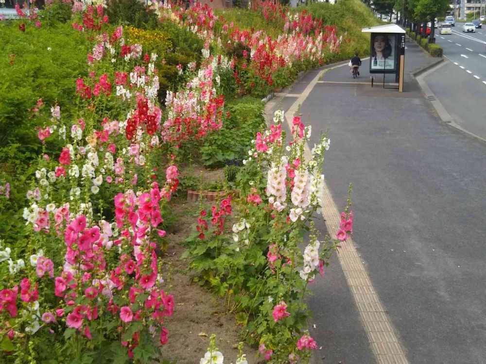 この時期、立葵/タチアオイの群生が花を咲かせます☺️