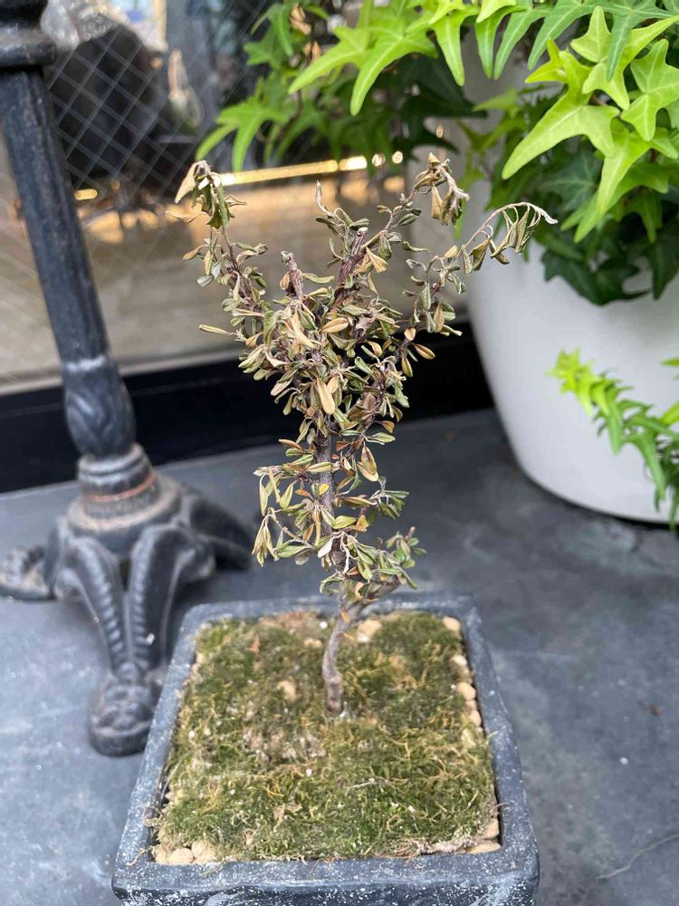 土が乾ききってるのが気になります。苔も乾いてるけど水足りてますか?盆栽仕立てだと普通の鉢植えより水やりの頻度が多くなりますよ。乾かないよう水やりして復活を期待しましょう。
