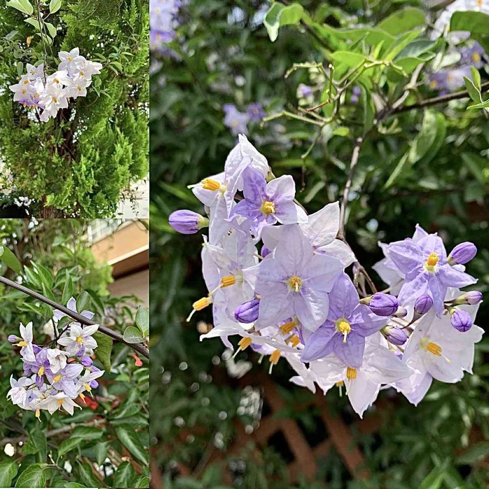 お出かけ先,ツルハナナス(蔓花茄子),高木にまつわり、空から降るように咲く白紫の花の投稿画像