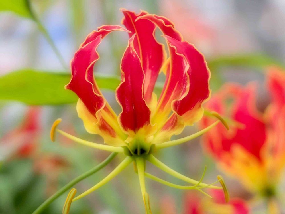 Gloriosa(グロリオサ)は、ラテン語の「gloriosus(見事な)」を語源とし、燃えるような鮮やかな花色と波打つようにそり返った華やかな花姿に由来するといわれます