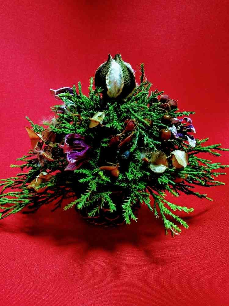 イブキの木の枝、ドライフラワーや木の実を挿して…