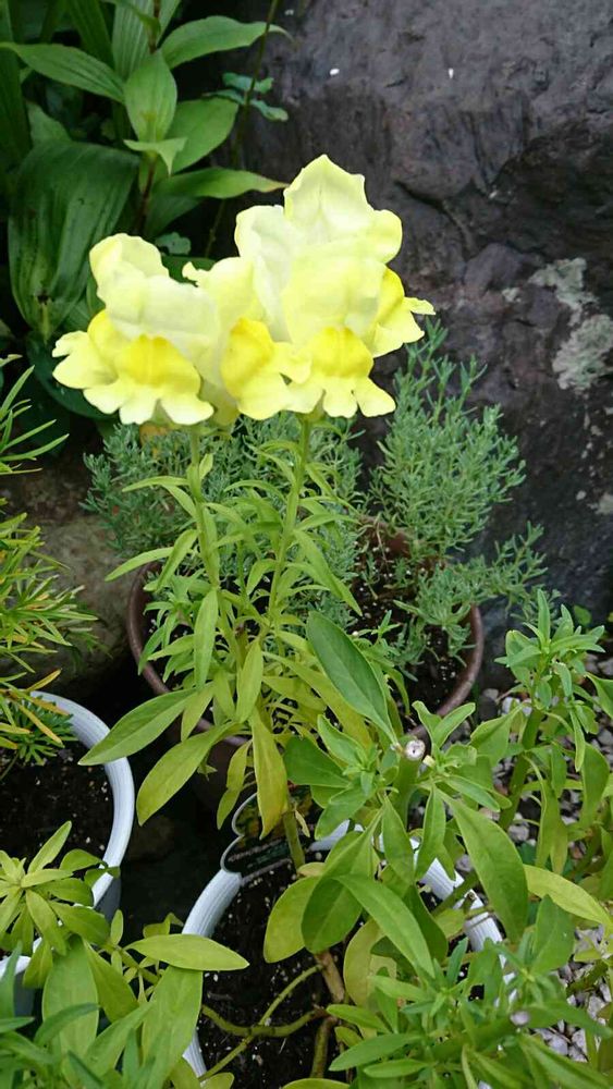 切り戻したらまた咲いた黄色の金魚草と、剪定の仕方がわからず適度に切ったラベンダー。