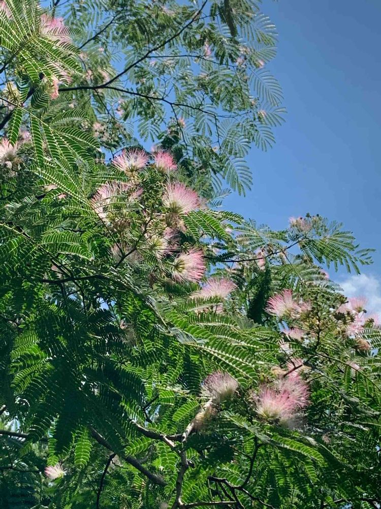 梅雨の中休みの晴れ間、青空にふんわり刷毛のようなピンクの花が素敵です✨