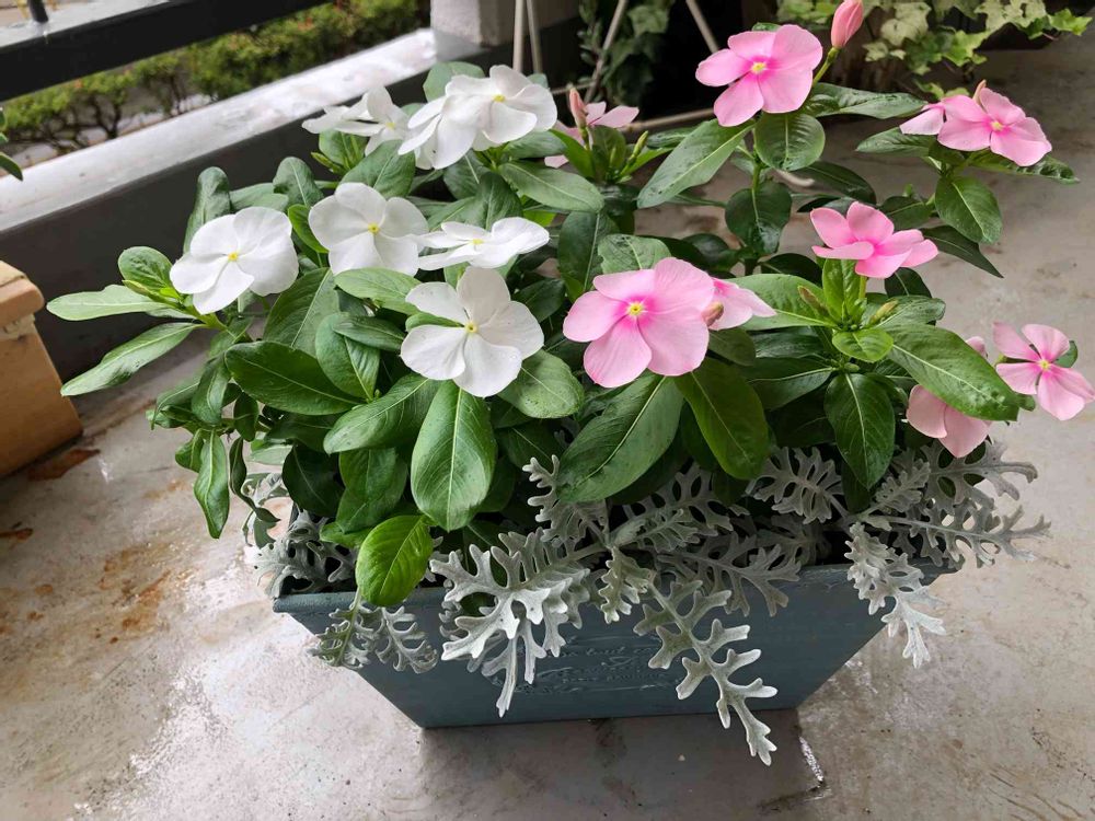 今、日々草は大きく育って、シロタエ菊が見えないくらいになりました。
