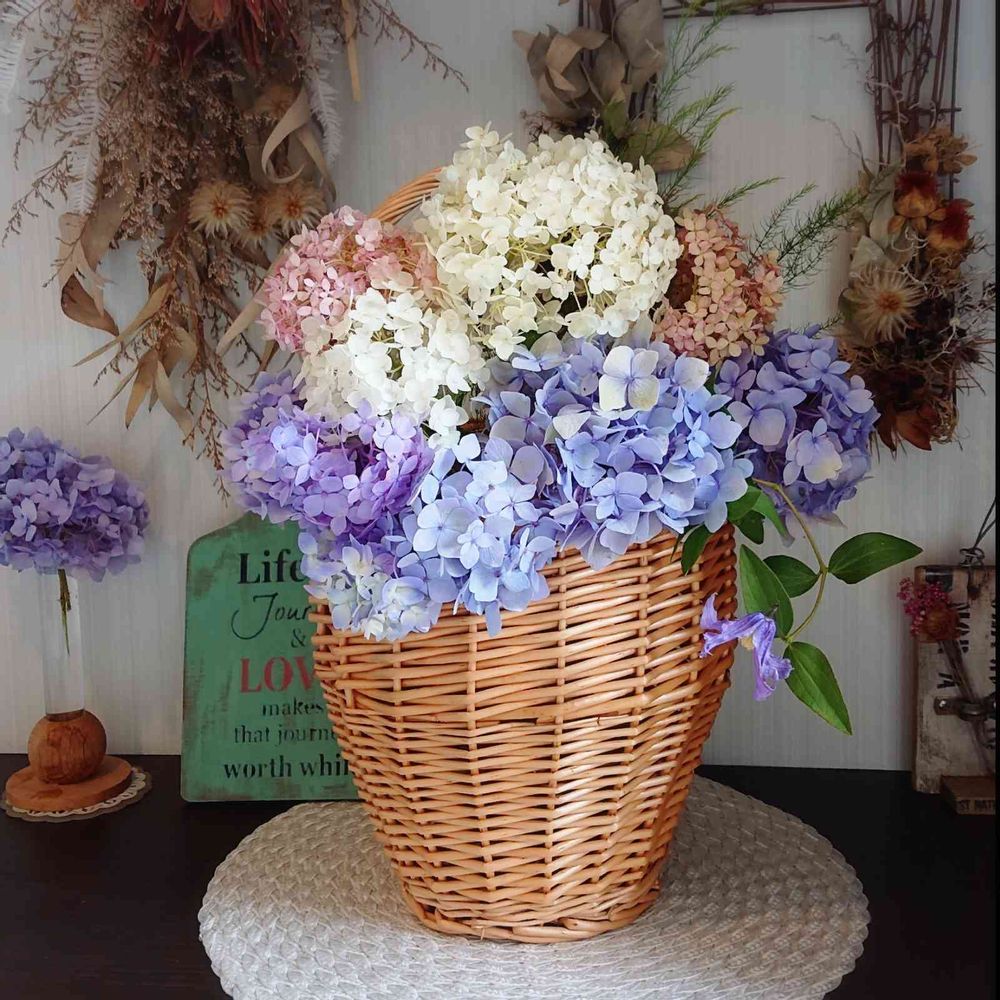 もりもりの紫陽花がゴージャスでよく合うわぁ〜これから季節の花やドライ入れたり楽しみだね(*ˊ˘ˋ*)。♪:*°