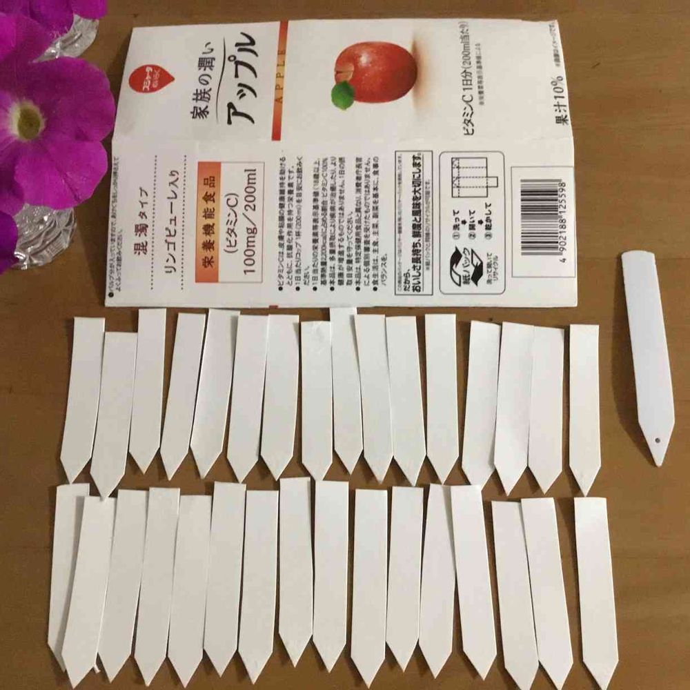 ペチュニアのネームプレートが少なくなってきたので、何か代用品はないかと考えた末、そうだ❗️紙パックがある❗️と思いつき、早速作ってみました。