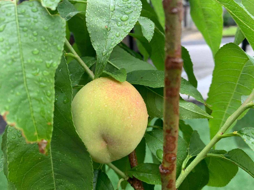 長野県からやってきたナツキと言う品種の桃の木🍑いくつも小さな実がなっていましたが、最近の風の影響で落ちてしまって一つだけ生き残りました✨家の庭に植えてから2ヶ月程経ち、ちょっとずつ成長してます🌲家の裏にある山から猿が狙っているので気をつけなければ、、、。笑