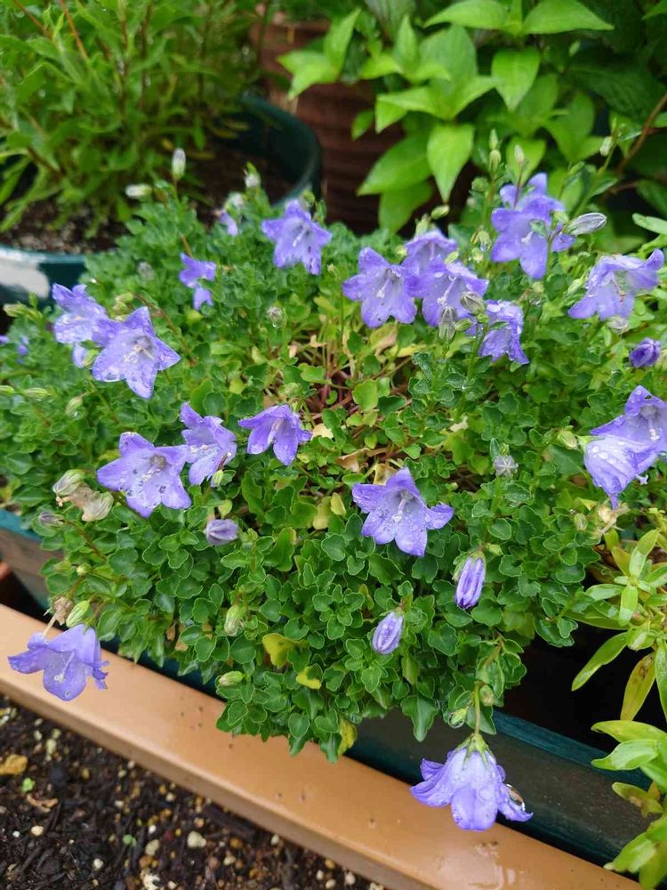 爽やかな青色の花が長期間咲くカンパニュラだけど雨に☔あてず夏のムレムレに注意が必要水は控え目だけど日光は☀️好き😲意外と注文が多いナ😅でも前に咲いた花からのこぼれ種でこの子の前のプランターにカンパニュラのおチビちゃんが出てた得した気分ダ👍⊂(•‿•⊂ )*.✧