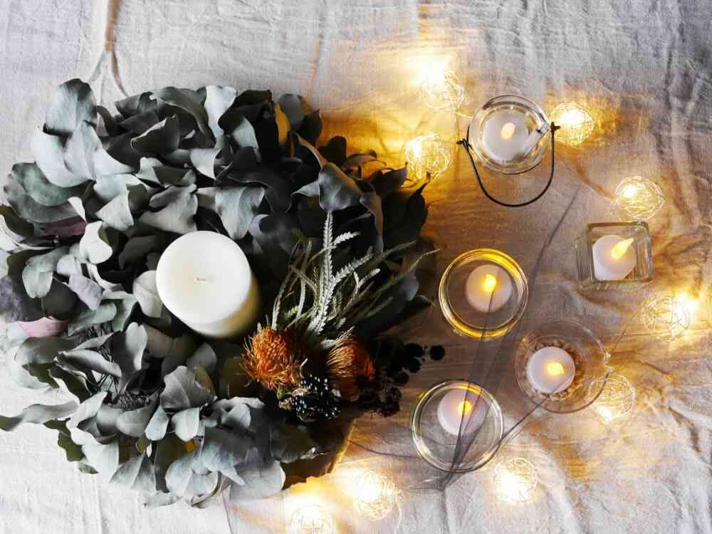 大好きな花屋さんで購入したドライリースとLEDライトでテーブルコーディネートしてみました。