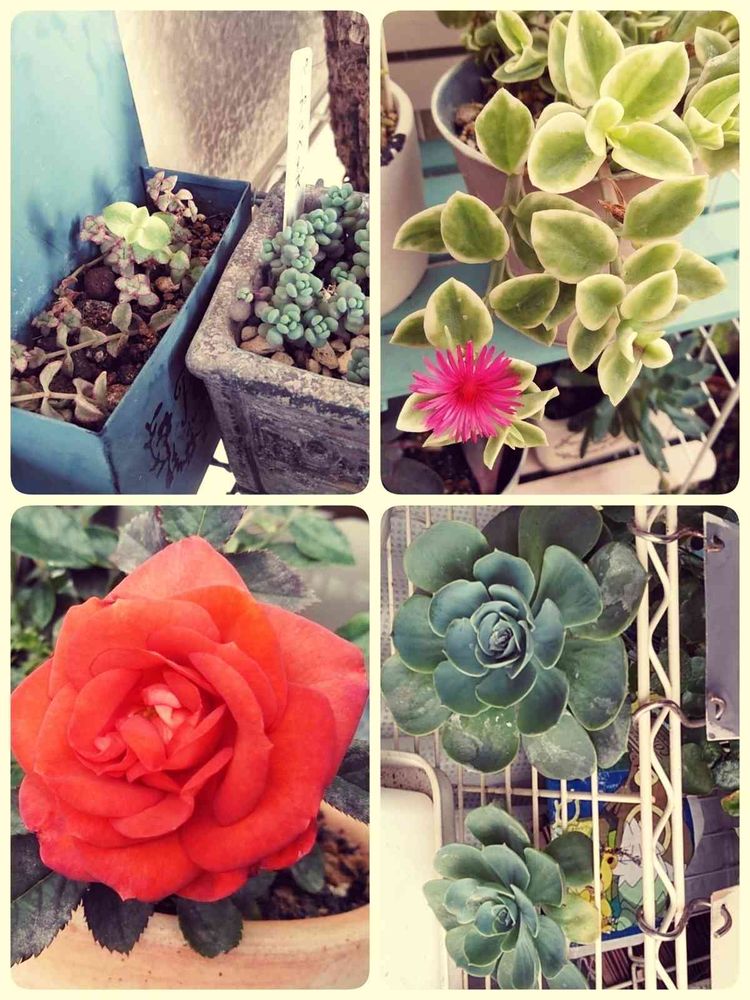 去年、農ランドで母が可愛いと気に入って購入した数種類寄せ苗の中にあったベビーサンローズ、初めて咲きました。(右上)