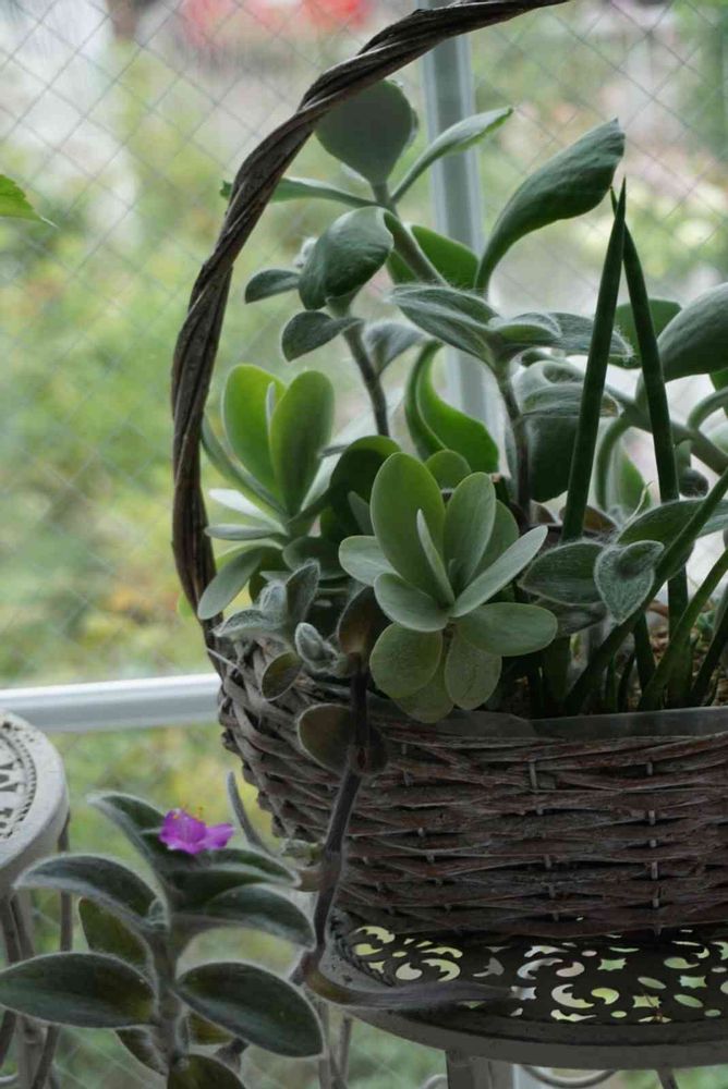 籠に入れた多肉?が延びてお花が咲いたよ🎵